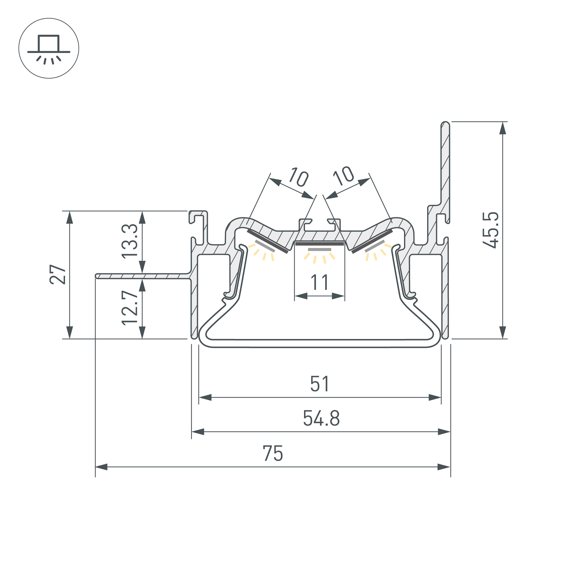 Алюминиевый профиль для натяжных потолков (боковая линия - монтаж к стене). Решение 2-в-1 - каркас для крепления натяжного потолка и профиль для установки светодиодной ленты. Для дизайнерских решений «линии света» в натяжных потолках. Монтируется к стене, накладной способ. Натяжной потолок крепится к профилю с одной стороны. Габаритные размеры (L×W×H): 2000x75x45,5мм. Ширина центральной площадки для ленты 11мм, боковых площадок - 10 мм. Экраны, заглушки и другие аксессуары приобретаются отдельно. Цена за 1 метр.